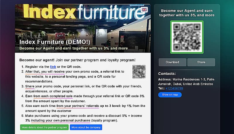 - People will visit your website, learn about the affiliate program, and receive their own websites (copies of yours), personal promo code, and QR code — all linked to your business.